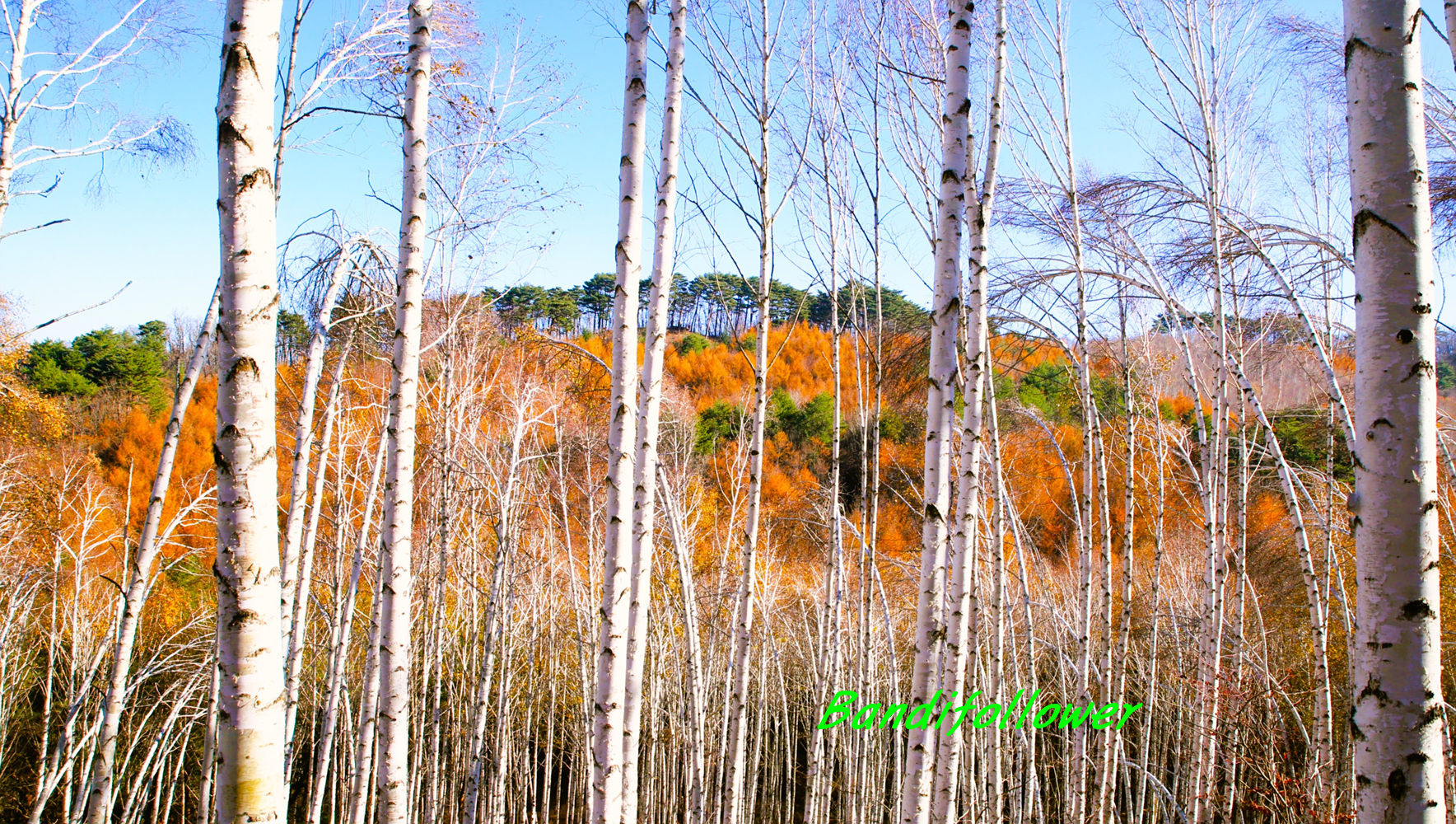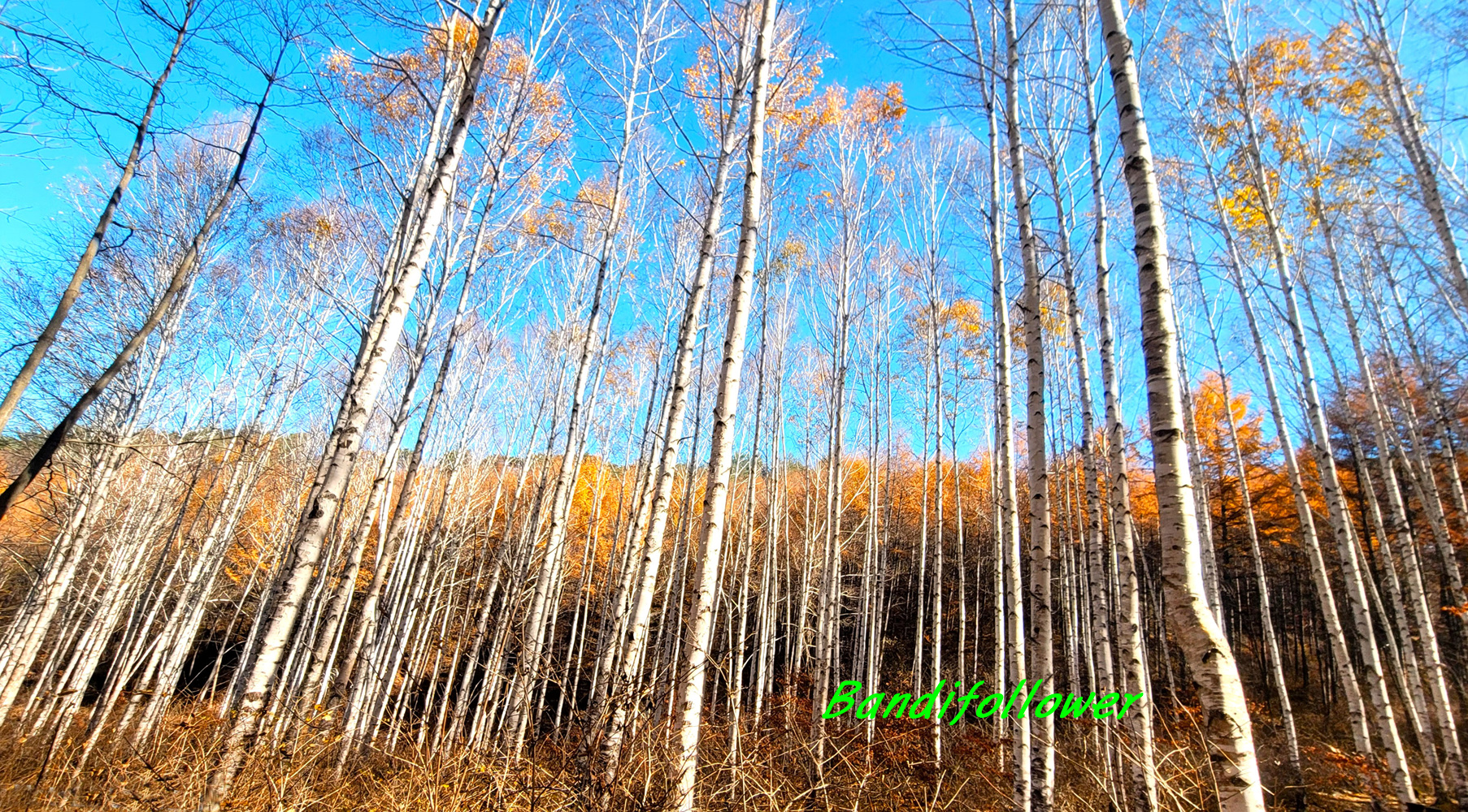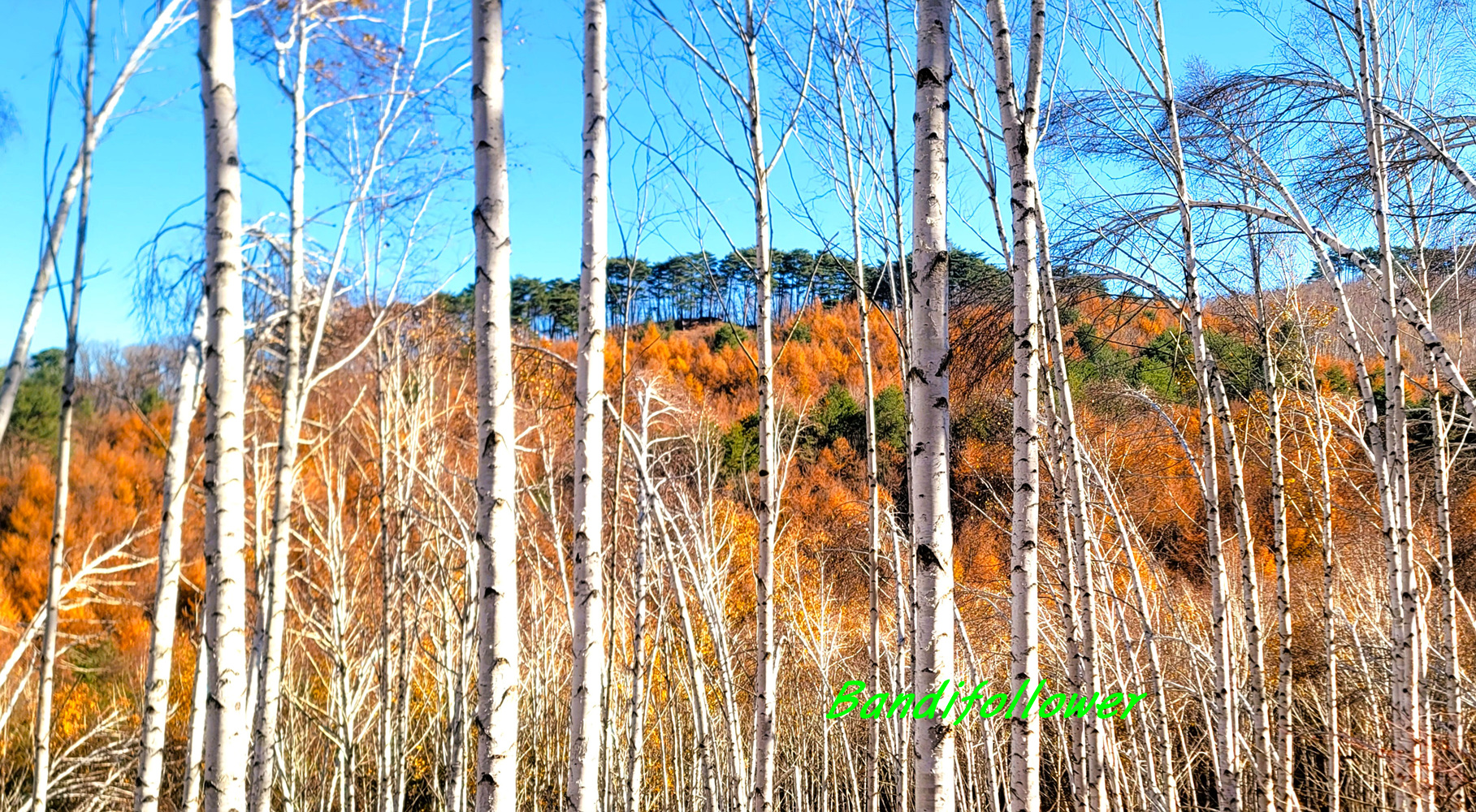 인제 원대리의 자작나무 숲에는 잎갈나무의 단풍이 곱게 물들어서